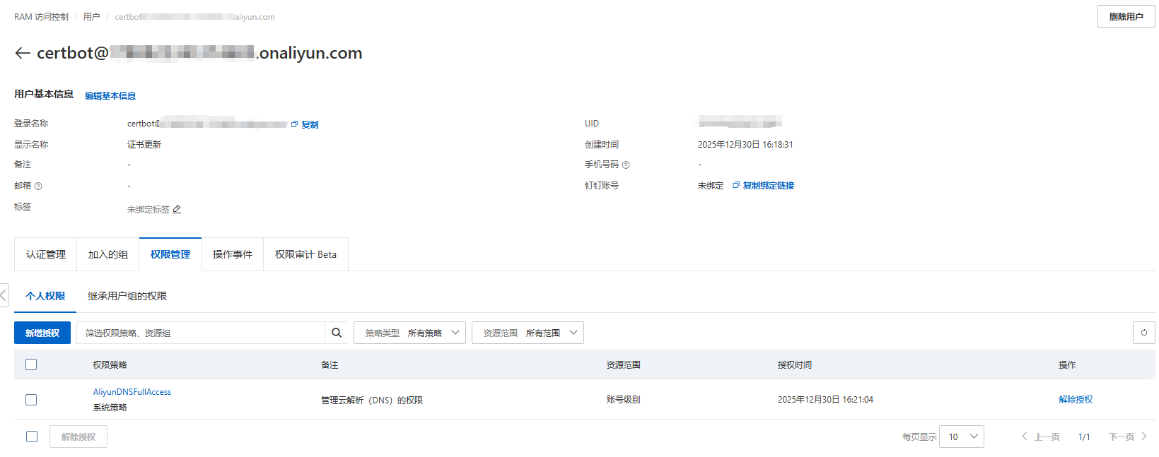 创建一个阿里云子账号,授权AliyunDNSFullAccess,管理云解析(DNS)的权限